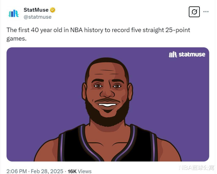 此役,詹姆斯还创下了NBA前无古人的神迹。数据显示:詹姆斯已经连续5场拿到25+,他成为了NBA历史上首位做到在40岁后连续5场25+的球员。这也意味着,现年40岁的詹姆斯,成为了该项数据上的NBA历史第1人。